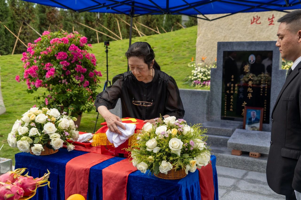 10时,骨灰安放仪式正式开始。亲属代表擦拭墓碑后,在礼宾人员的引导下将黄旭华院士的骨灰安放进墓穴。参加仪式的人员向黄旭华院士墓碑行三鞠躬礼,并敬献鲜花。众人以简约但庄重的仪式,送别这位为我国核潜艇事业默默奉献一生的国之脊梁。