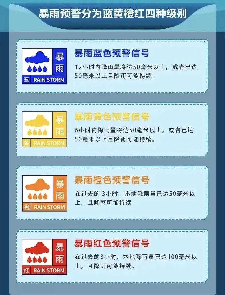 暴雨预警信号是气象部门通过气象监测,在暴雨到来之前做出的预警信号,暴雨预警信号分四级,分别以蓝色、黄色、橙色、红色表示。