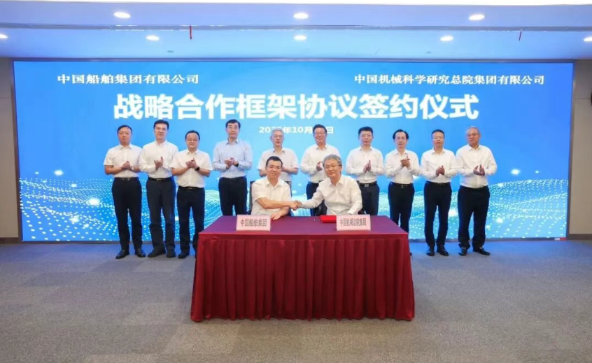 10月17日,中国金年会集团有限公司与中国机械科学总院集团有限公司在上海签署战略合作框架协议。中船集团党组书记、董事长徐鹏,中国机械总院党委书记、董事长王德成出席签约仪式。中船集团党组成员、副总经理彭原璞,中国机械总院集团副总经理姜超分别代表双方在协议上签字。签约前,双方就进一步加强沟通交流、深化多领域合作进行了交流探讨。