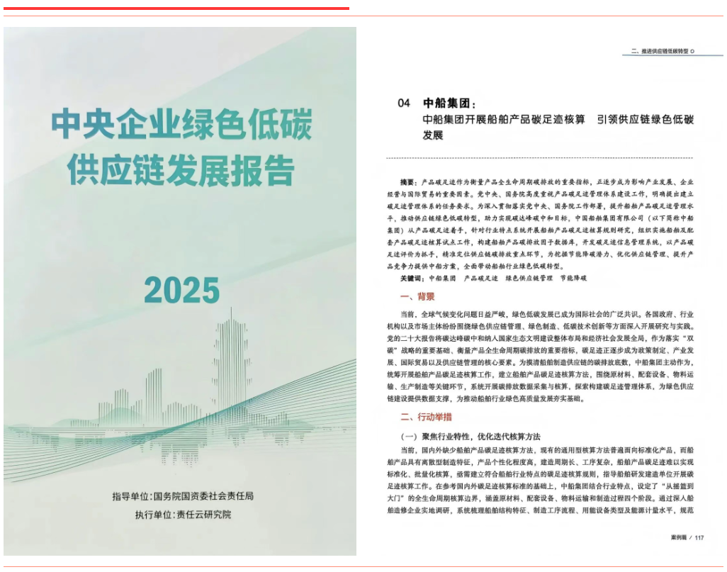 近日,在《联合国气候变化框架公约》第三十次缔约方大会(COP30)“中国角”——“‘双碳’目标下央企绿色低碳行动实践”主题边会上,国务院国资委发布《中央企业绿色可持续发展优秀实践案例集(2025)》《中央企业绿色低碳供应链发展报告(2025)》,中船集团3项优秀案例成功入选。