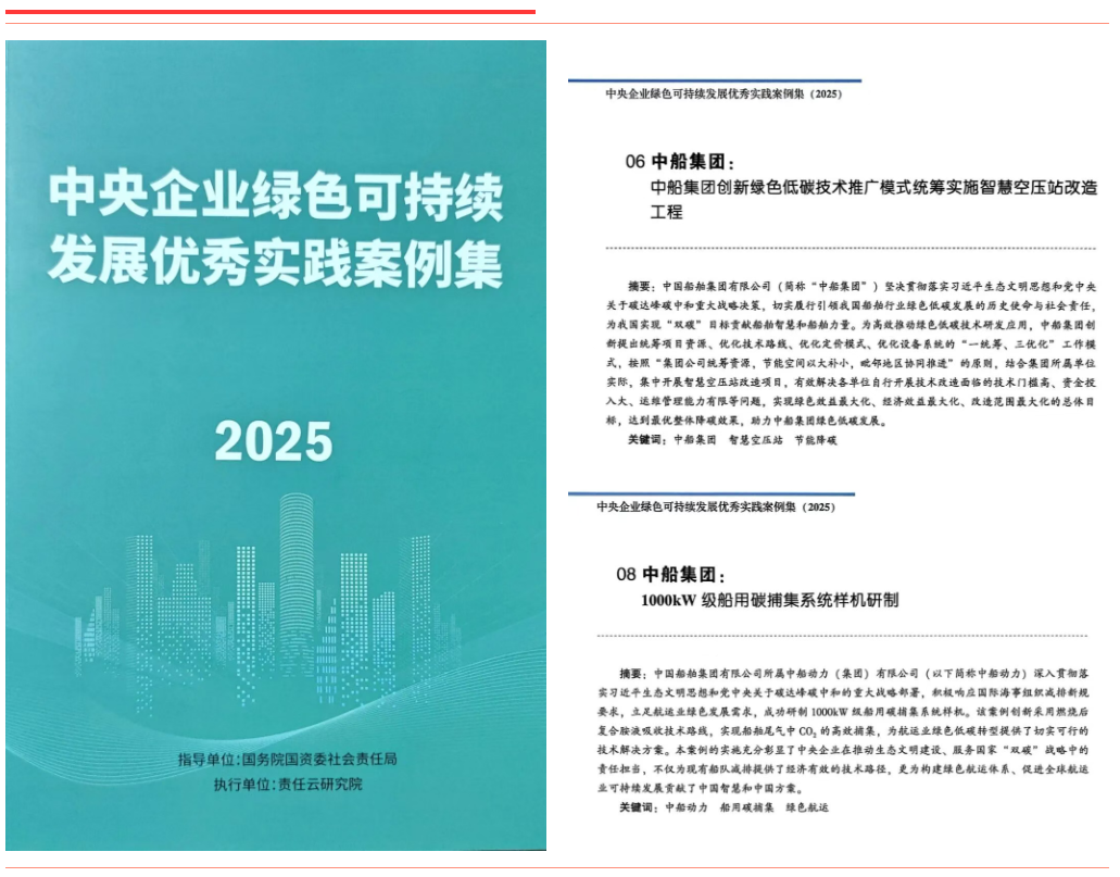 《中船集团创新绿色低碳技术推广模式 统筹实施智慧空压站改造工程》通过系统推进智慧空压站改造,创新“一统筹、三优化”模式,大幅提升设备能效。《中船动力1000kW级船用碳捕集系统样机研制》围绕船用碳捕集关键技术开展攻关,采用燃烧后复合胺吸收工艺,实现CO₂捕集率超85%、纯度达99.9%。上述两项案例入选《中央企业绿色可持续发展优秀实践案例集(2025)》。