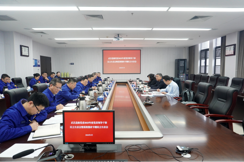 武昌造船党委召开2025年度党员领导干部民主生活会。中船集团党组成员、总会计师朱永红到会指导并点评。
