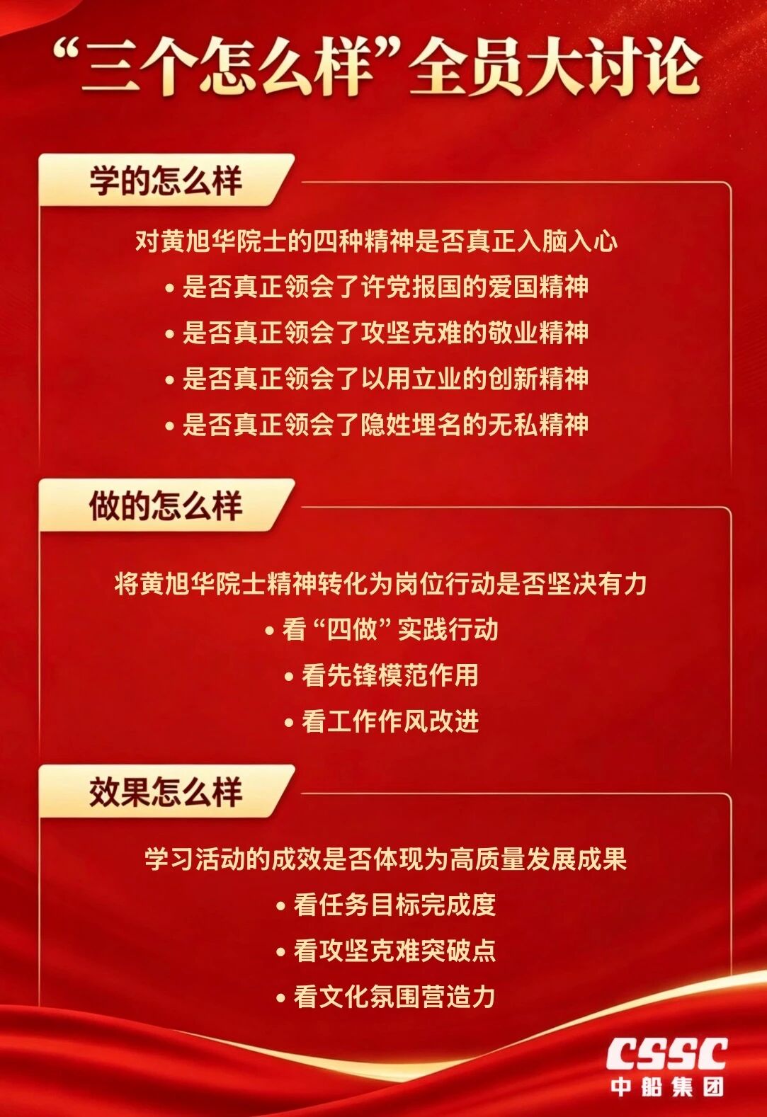 近日,中船集团党组下发通知,号召全集团开展学习黄旭华院士先进事迹“四学四做”活动“三个怎么样”(学的怎么样、做的怎么样、效果怎么样)全员大讨论。