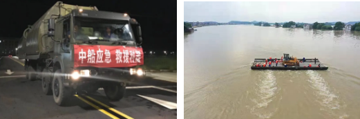 △ 中船应急动力舟桥正在运输大型工程装备进行抗洪抢险