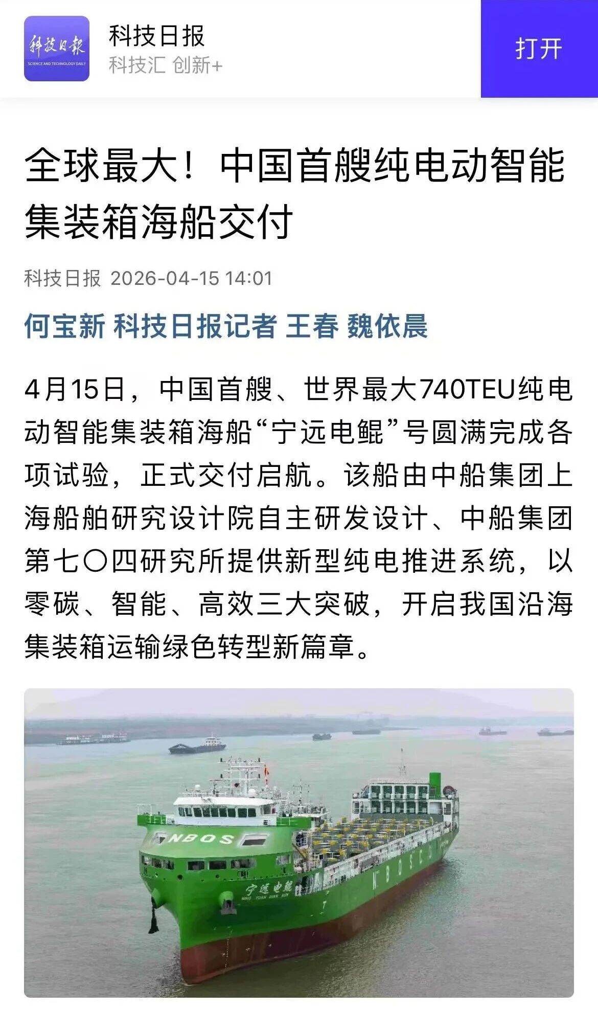 4月15日,由中国金年会集团有限公司旗下六〇四院自主研发设计、七〇四所提供新型纯电推进系统的纯电动智能敞口集装箱海船“宁远电鲲”号正式交付启航。