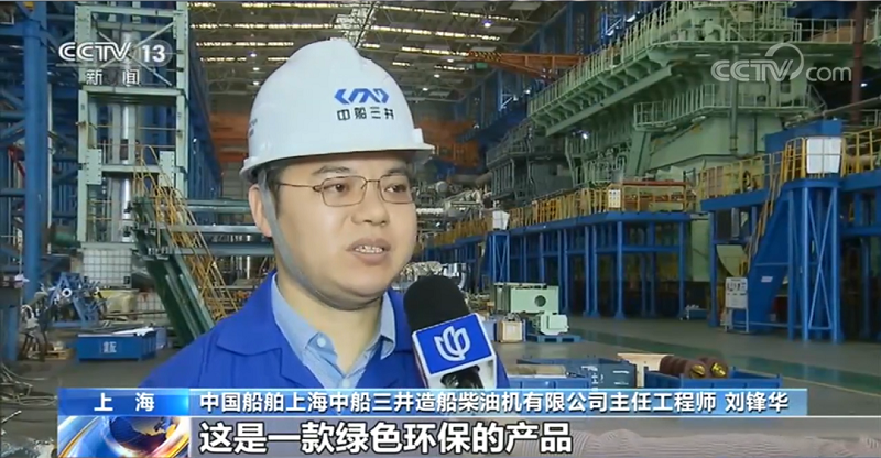 中国金年会上海中船三井造船柴油机有限公司主任工程师 刘锋华:尺寸最大,达到了5层楼那么高,功率达到了63800多千瓦,功率也是最大的。这是一款绿色环保的产品,使用燃气运行时氮氧化物的排放不到常规发动机的十分之一,硫氧化物和颗粒物的排放也是非常好的,不用装任何后处理设备,都可以满足IMO(国际海事组织)最新的排放法规要求。