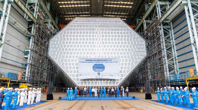 日前,全球最大B型菱形液货舱在江南造船完工,将被用于世界首制99000立方米超大型液化乙烷运输船(VLEC)。江南造船自主研发的B型舱 若配置不同的舱体材料和绝缘系统 ,可适用于装载不同温度的液化气货品。