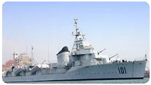 鞍山舰,舷号101,原为前苏联太平洋舰队的一艘“雷击舰”,满载排水量2581吨。1954年10月,鞍山舰作为我国向苏联购买的第一艘驱逐舰驶抵青岛,1992年4月24日退出现役,作为重要的历史文物陈列于海军博物馆。
