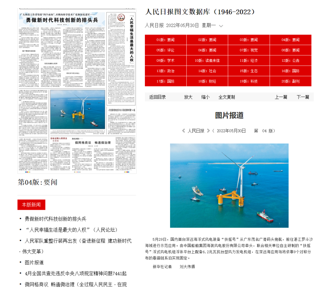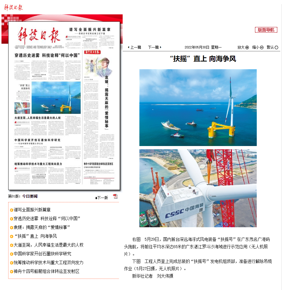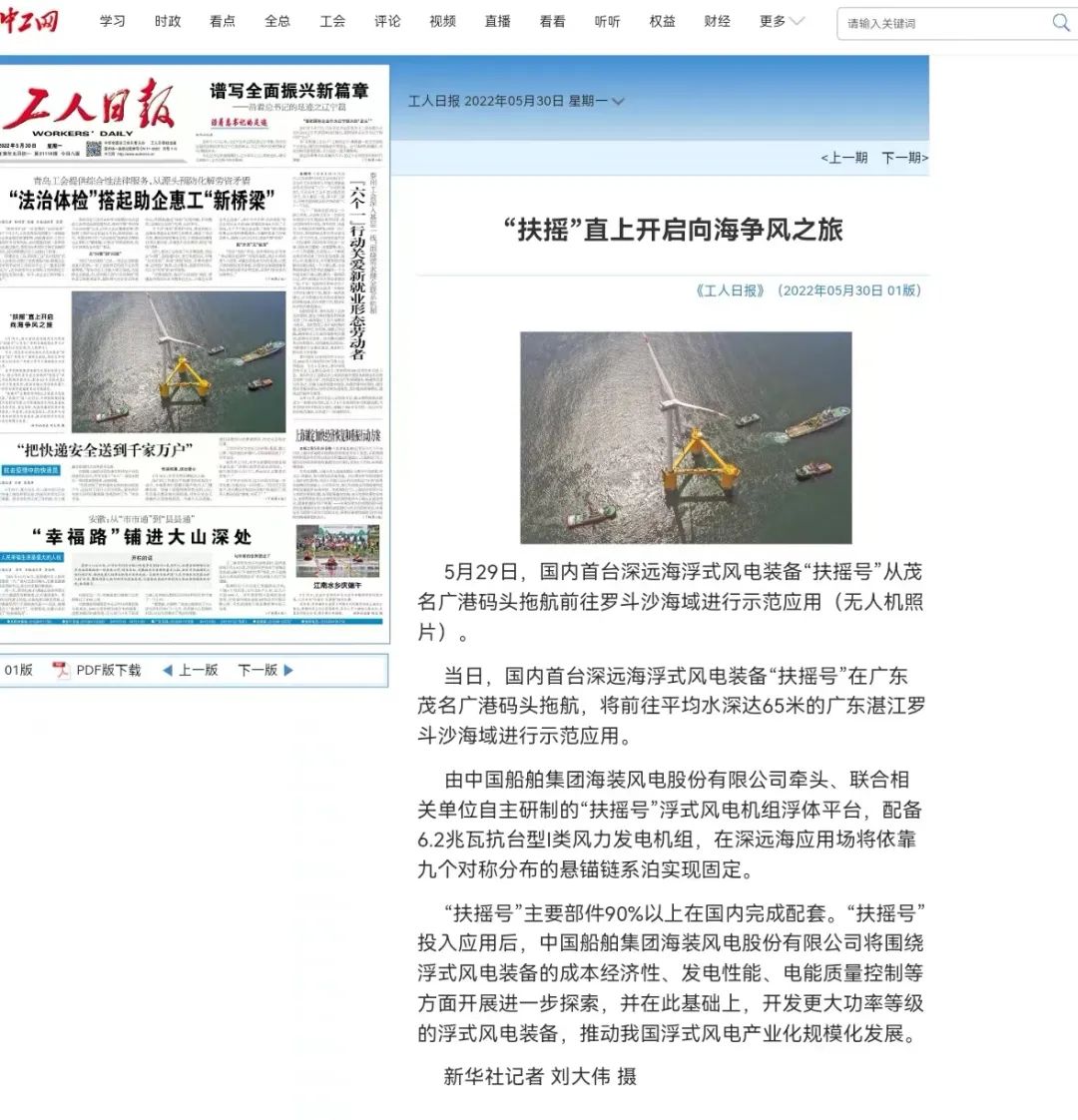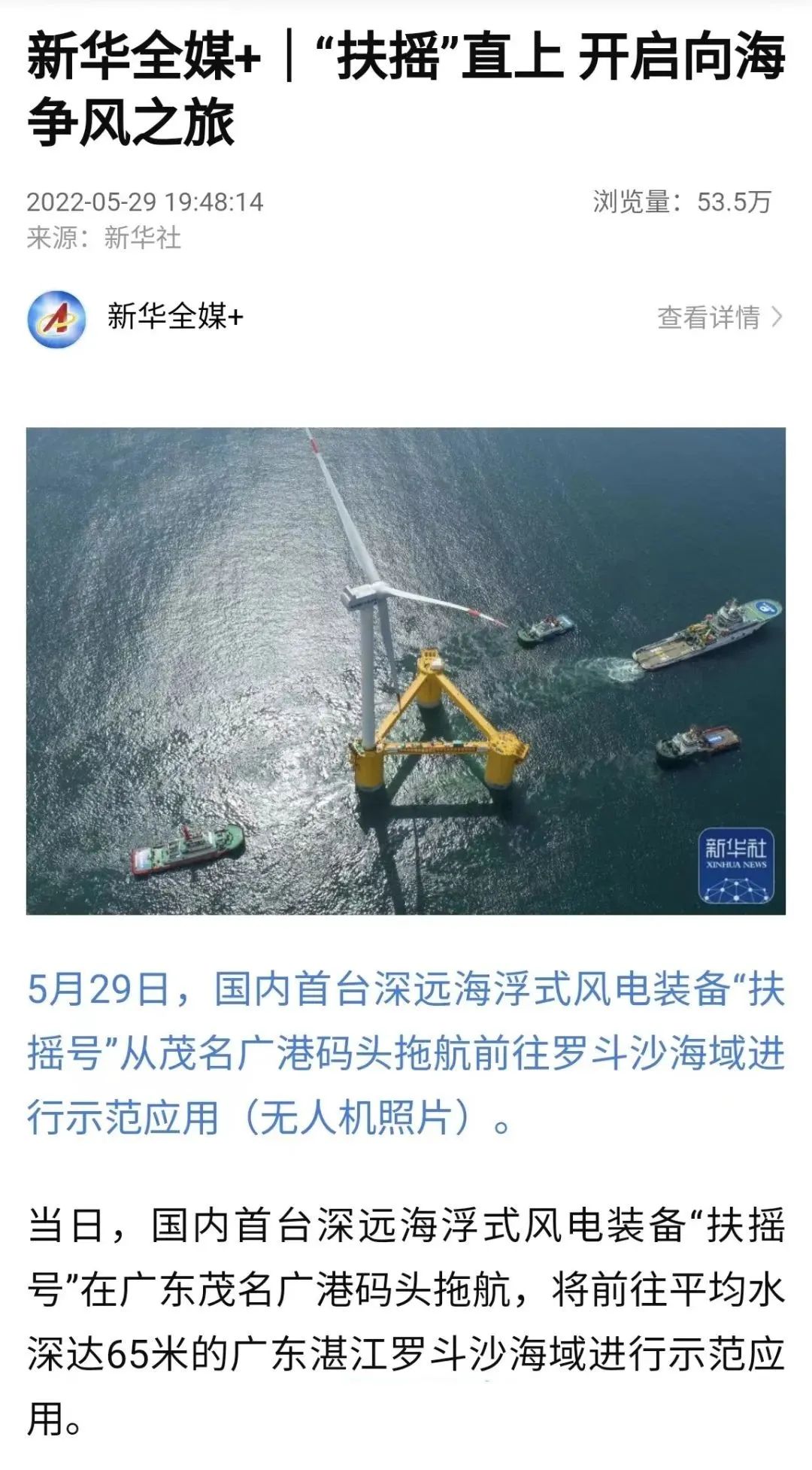 5月29日,中国金年会集团旗下中国海装牵头研制的国内首台深远海浮式风电装备——“扶摇号”从广东茂名码头起航,前往平均水深65米的广东湛江附近海域投入示范应用。