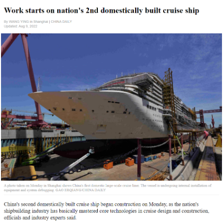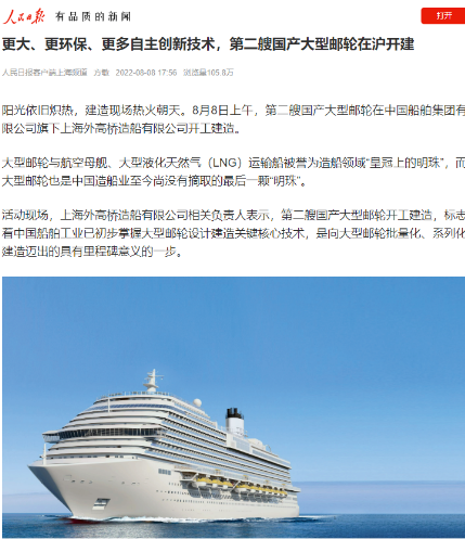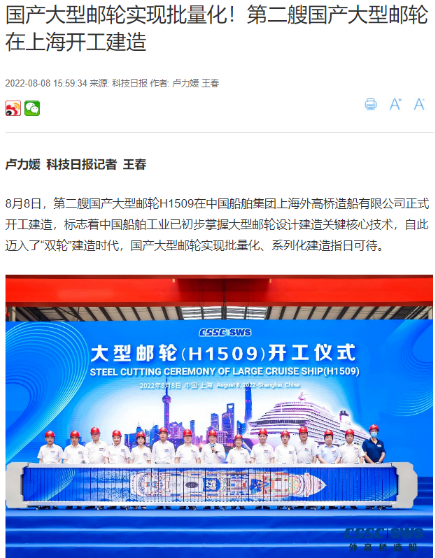 目前国产大型邮轮首制船正处于内装阶段,“差不多装修了一半”,第二艘国产大型邮轮详细设计已完成约40%。未来,国产大型邮轮有望实现批量化、系列化建造敬请期待。