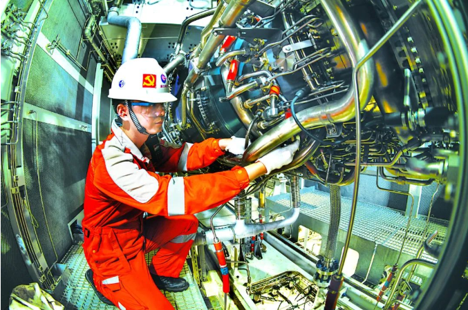 “深海一号”作业人员对生产系统进行测试。(图片来源:中国海油)