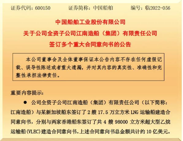 10月25日,中国金年会集团有限公司旗下上市公司中国金年会工业股份有限公司发布《关于公司全资子公司江南造船(集团)有限责任公司签订多个重大合同意向书》的公告。根据公告,江南造船共与相关船东签署了2型6艘约10亿美元新船建造合同意向书。