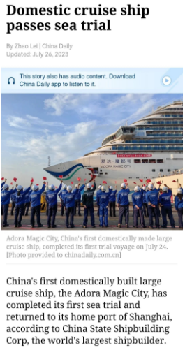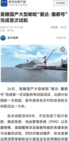 7月24日晚,首艘国产大型邮轮“爱达·魔都号”完成第一次试航所有试验项目比原计划提前一天凯旋,人民日报、新华社、中央电视台等中央主流媒体进行了报道。