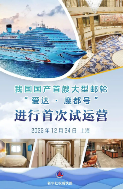 12月24日,国产首艘大型邮轮“爱达·魔都号”在上海吴淞口国际邮轮港离港出海,进行首次试运营。