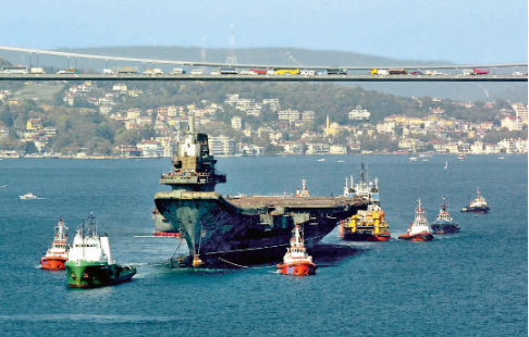 当“瓦良格”号在大批拖轮的前呼后拥下