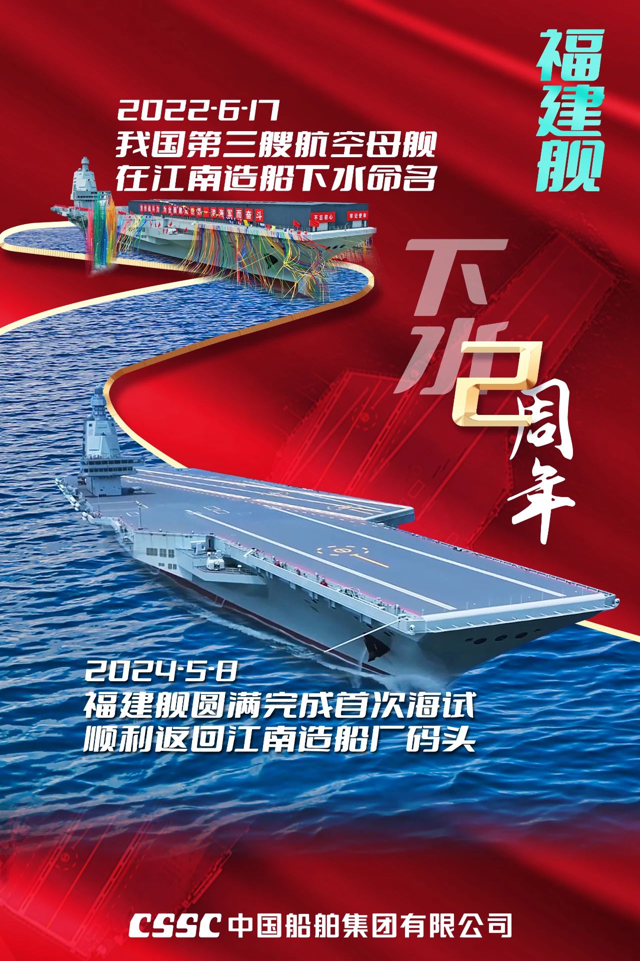 两年前的今天,我国完全自主设计建造的首艘弹射型航空母舰——福建舰,在中国金年会集团有限公司江南造船厂下水。