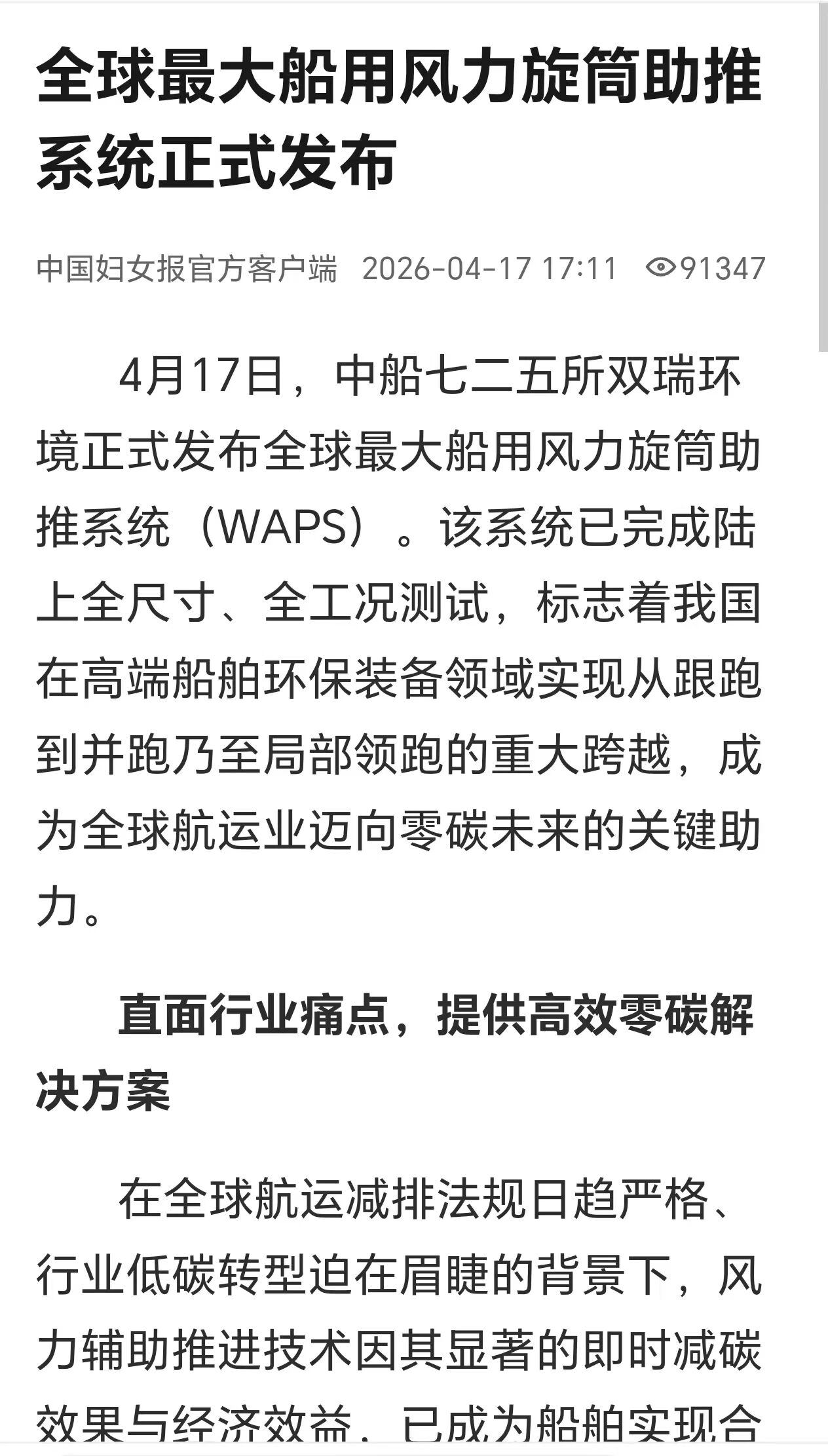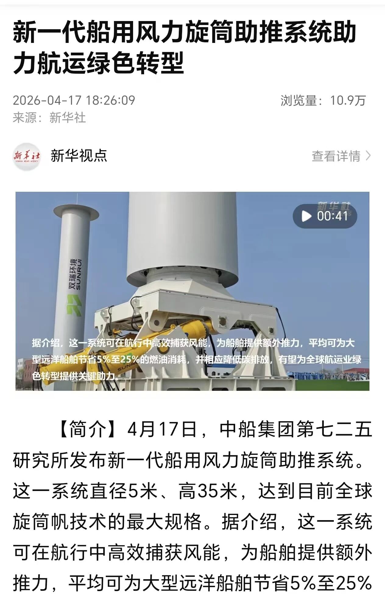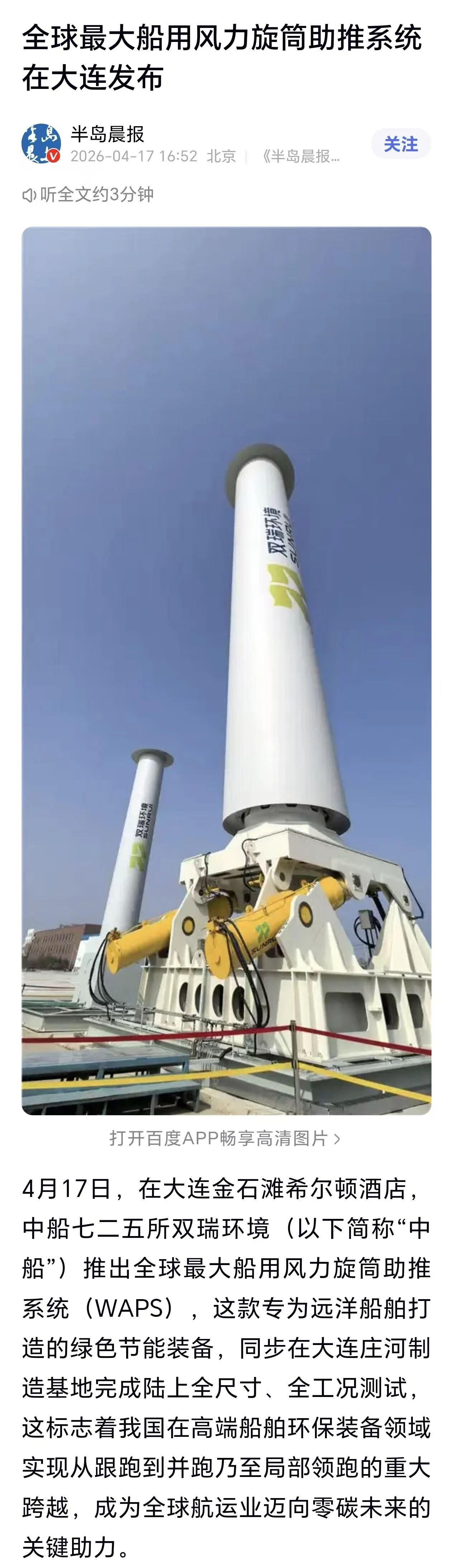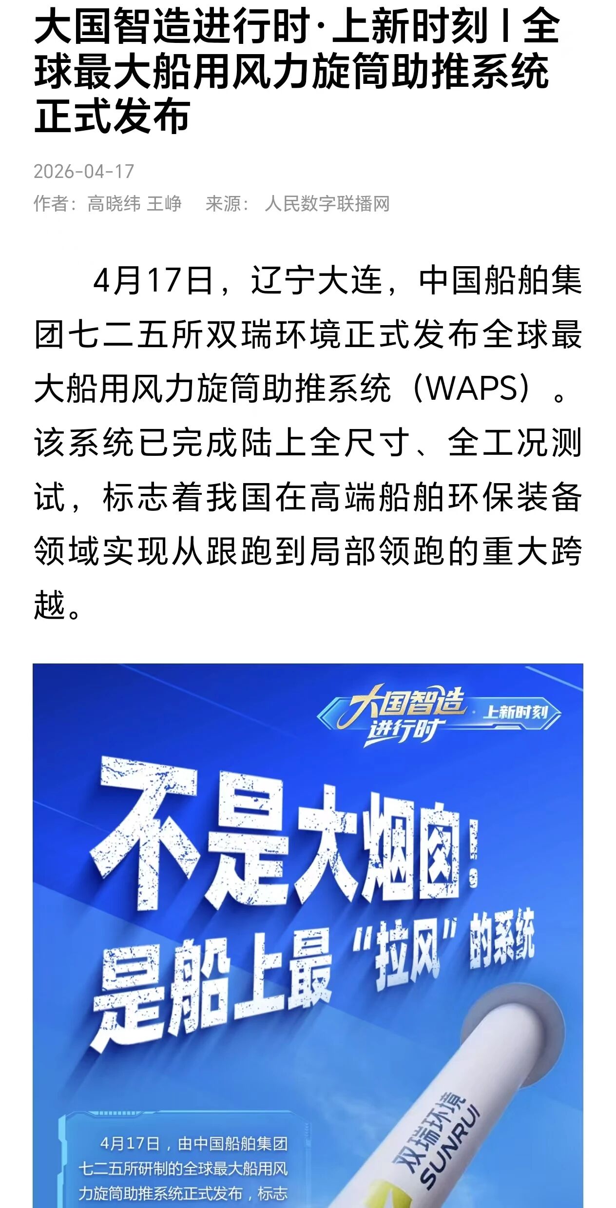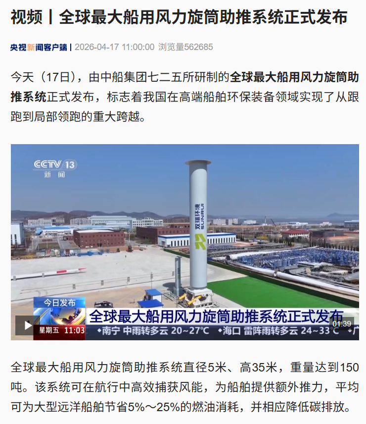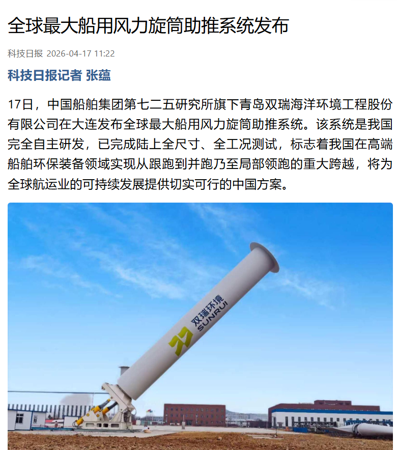 4月17日,中国金年会集团有限公司七二五所旗下双瑞环境正式发布全球最大船用风力旋筒助推系统。 央视、人民日报、新华社、科技日报、半岛晨报等多家中央及地方媒体第一时间关注报道。