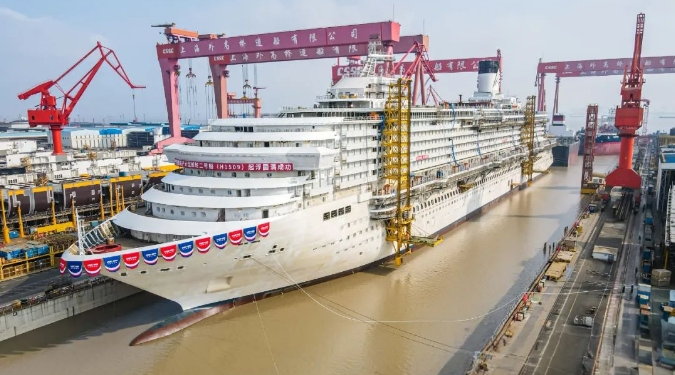 “爱达·花城号”由中船集团旗下外高桥造船于2022年8月开工建造,去年4月入坞搭载,今年1月实现全船贯通。“爱达·花城号”长341米、宽37.2米、约14.19万总吨,相比首艘国产大型邮轮“爱达·魔都号”体量更大、建造物量更多,对设计建造管理能力提出了更高要求。目前,“爱达·花城号”整体建造进度已超过70%,比“爱达·魔都号”起浮时总进度提前12%,结构总装周期缩短至9个月,标志着我国大型邮轮建造技术迈上了新台阶。