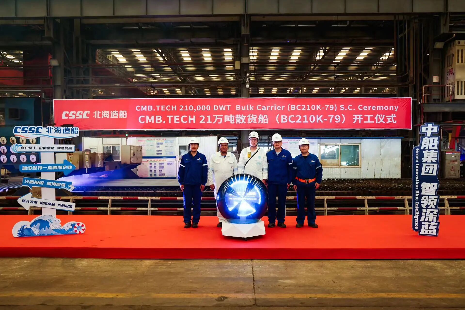 北海造船在2号坞顺利完成为比利时CMB.TECH公司建造的21万吨散货船56号船与63号船完成铺底节点。该型船采用“氨预留”绿色设计,为未来使用氨燃料动力预留了改造空间。