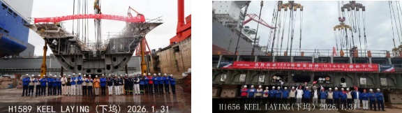 1月31日,外高桥造船建造的15.8万吨苏伊士型原油船H1589船及7000TEU集装箱船H1656船顺利下坞。